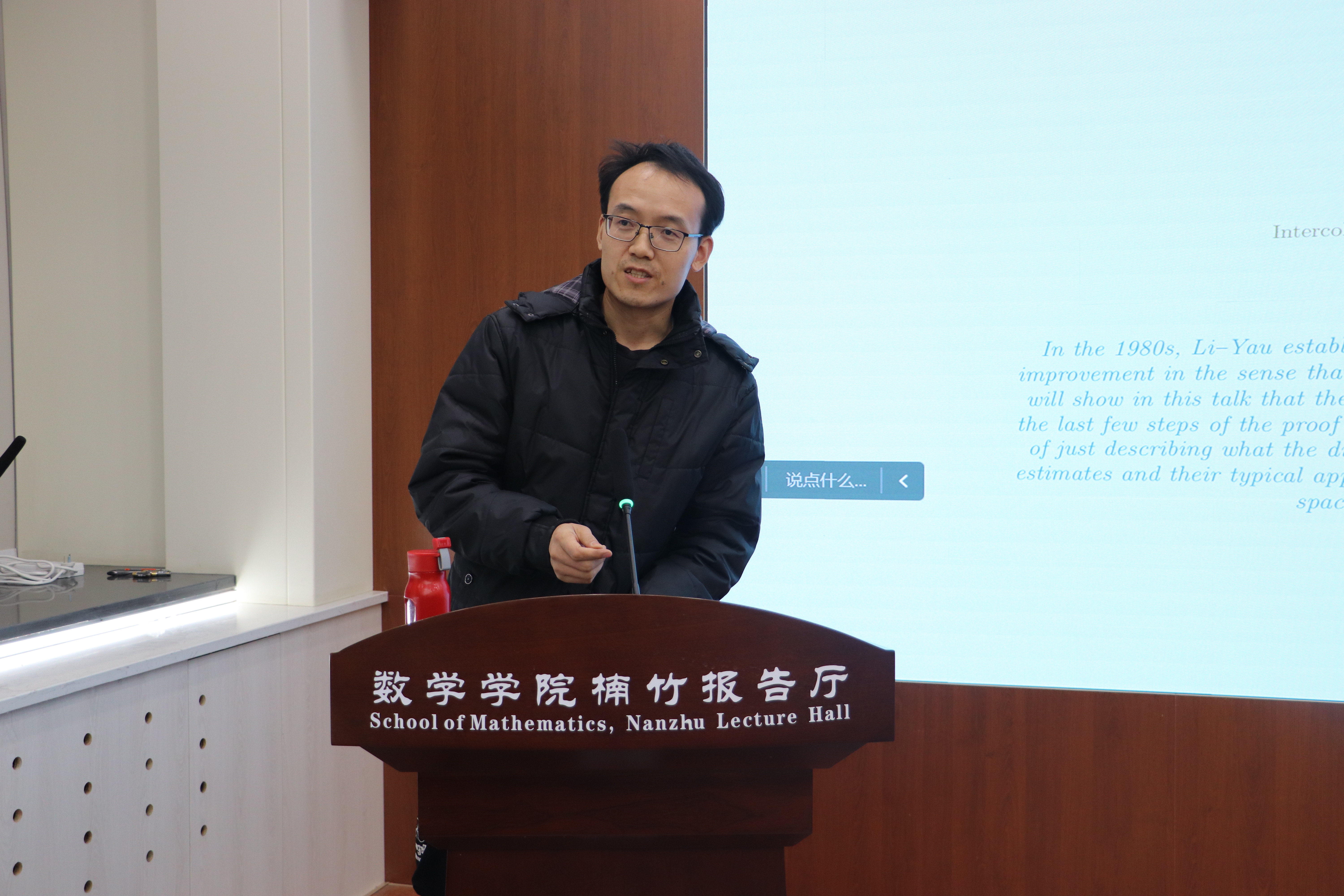 李志夙副教授作了题为《热方程的李伟光-丘成桐估计浅谈》的报告。他详细介绍了自己对热方程李伟光—丘成桐梯度估计的一些新的研究,在引导大家观察演算热核的基础上,详细推导了欧氏空间上的李—丘估计。在一步一步的推理中,同学们紧跟证明思路,聚精会神,认真聆听,最终了解了这个定理的基本面貌。同时,大家对如何读书学习写算做研究也有了更多的启发。