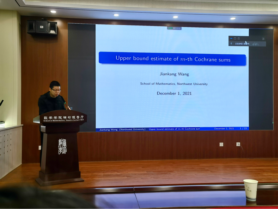 今年会jinnian官网博士生王健康,报告主题为《Upper bound estimate of m-th Cochrane sums》。报告首先介绍了研究的背景:因为Dedekind和的具体形式没有办法给出,所以吸引了众多学者对其性质进行研究。而在历史发展过程中出现了Cochrane和,在报告中给出了两种和的简单对比,发现后者比前者有着更好的性质。因此报告中在研究前人经验结果的基础上,给出了一些定理并利用一些引理对其进行了证明。研究主要目的在于利用参数估计将两种和统一起来。