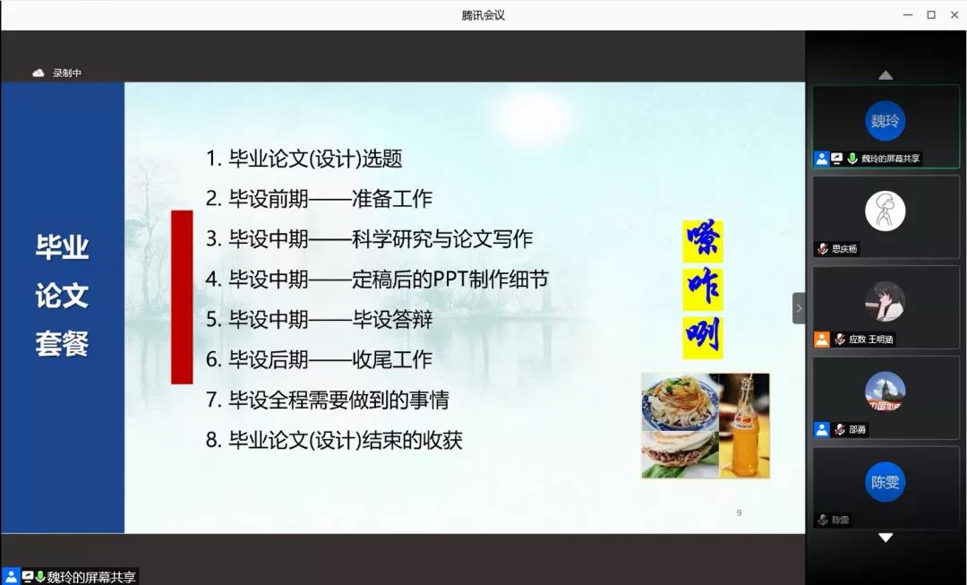 魏老师提出本科毕业论文设计(以下简称毕设)是大学时代的最后一次大作业。魏老师分别从毕设的必要性、完成毕设所需的能力要求、毕设整体流程以及常见问题四个方面带领同学们走进毕设,揭开毕设的“真面纱“。首先,阐述了同学们完成毕设的必要性,对于国家而言,这是我国本科培养计划中规定的综合性实践教学环节;对于学校而言,这是衡量高等学校教学教育质量和办学效果的重要评价内容;对于同学而言,不论是选择继续深造或者走向社会,它都是对于四年高等教育后综合能力与素质的全面检验,更是为我们以后的科研或实践打下良好的基础。接着,列举了一些有关完成毕设所需训练和提高的能力要求,包括前期调查研究、制定方案的设计能力和分析资料、数据处理的实践能力,以及撰写论文的书面表达能力等。接下来,魏老师将毕设比作“套餐“,为同学们详细介绍了毕设从前期、中期到后期的完整流程。其主要包括毕业设计选题及选题工作、准备工作、科学研究与论文写作、定稿后的PPT制作细节、毕设答辩和收尾工作。之后,强调了毕设全程需要做到的一些事情,也谈了谈毕设结束后将会有的收获。最后,梳理了毕设中同学们容易忽略的几个要点和会出现的常见问题,叮嘱同学们要用心对待毕设,与指导老师保持积极联系。