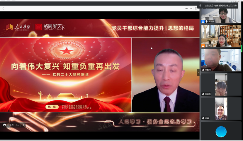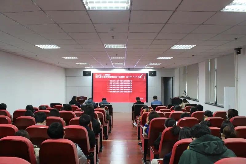 11月21日下午,jinnianhui今年会党委组织全院师生观看学习由中国发展改革报社副社长、中央广播电视总台特约评论员杨禹主讲的“党的二十大精神解读”专题学习。学院党政班子成员、各支部书记、师生党员代表集体在学院凌岭报告厅收看学习,各支部组织师生党员通过线上线下方式集中学习。