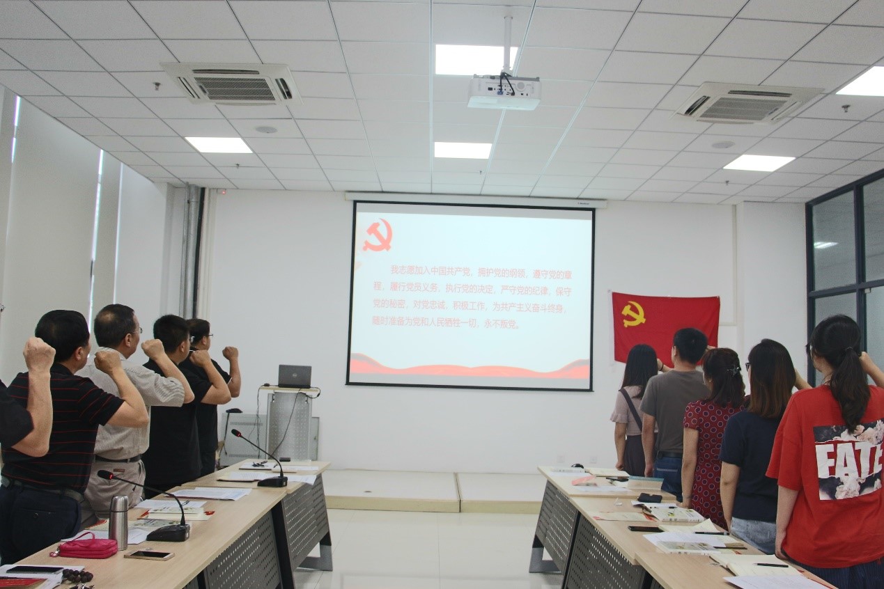 最后,全体与会人员面向党旗庄严宣誓、重温入党誓词。
