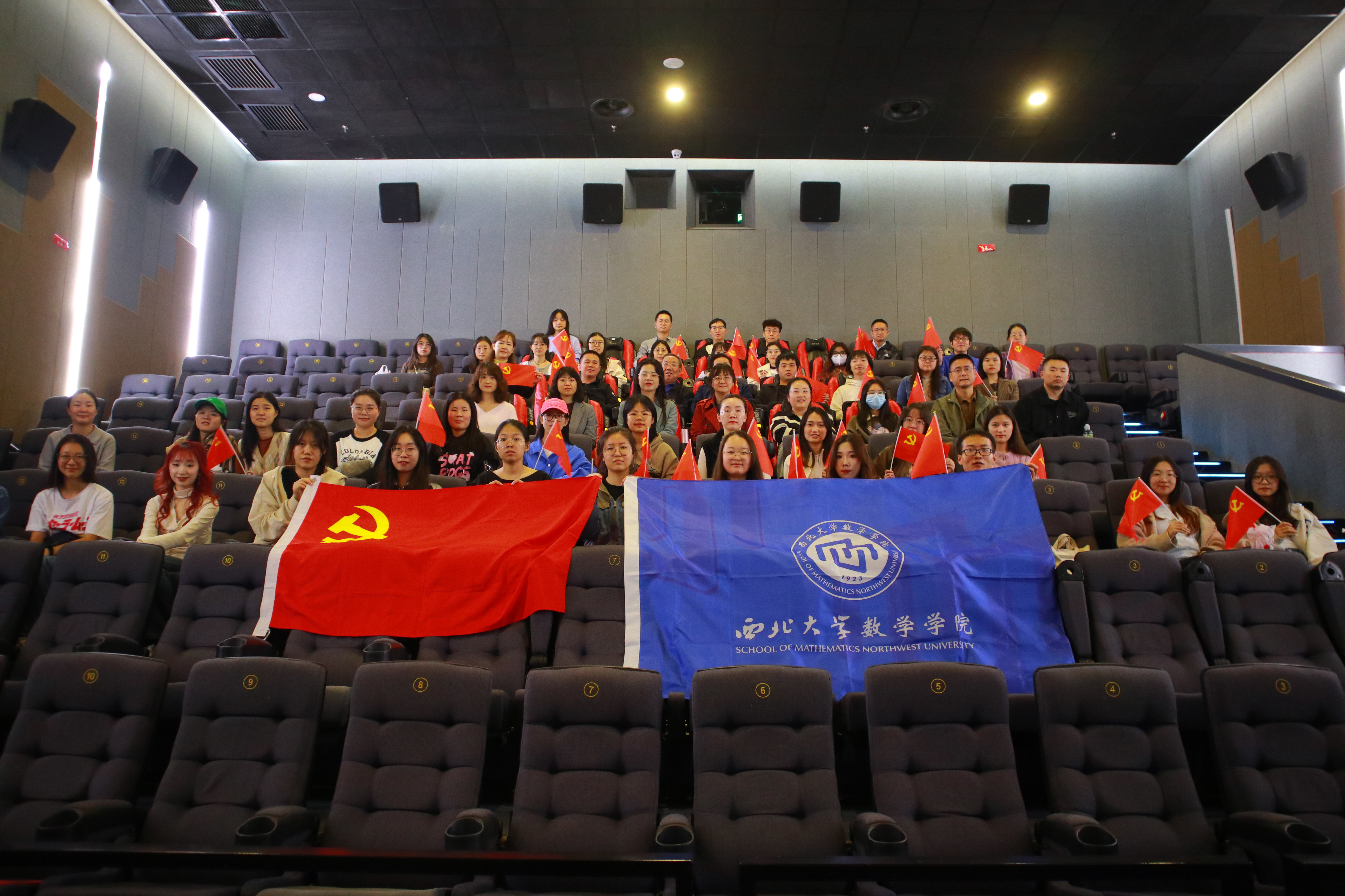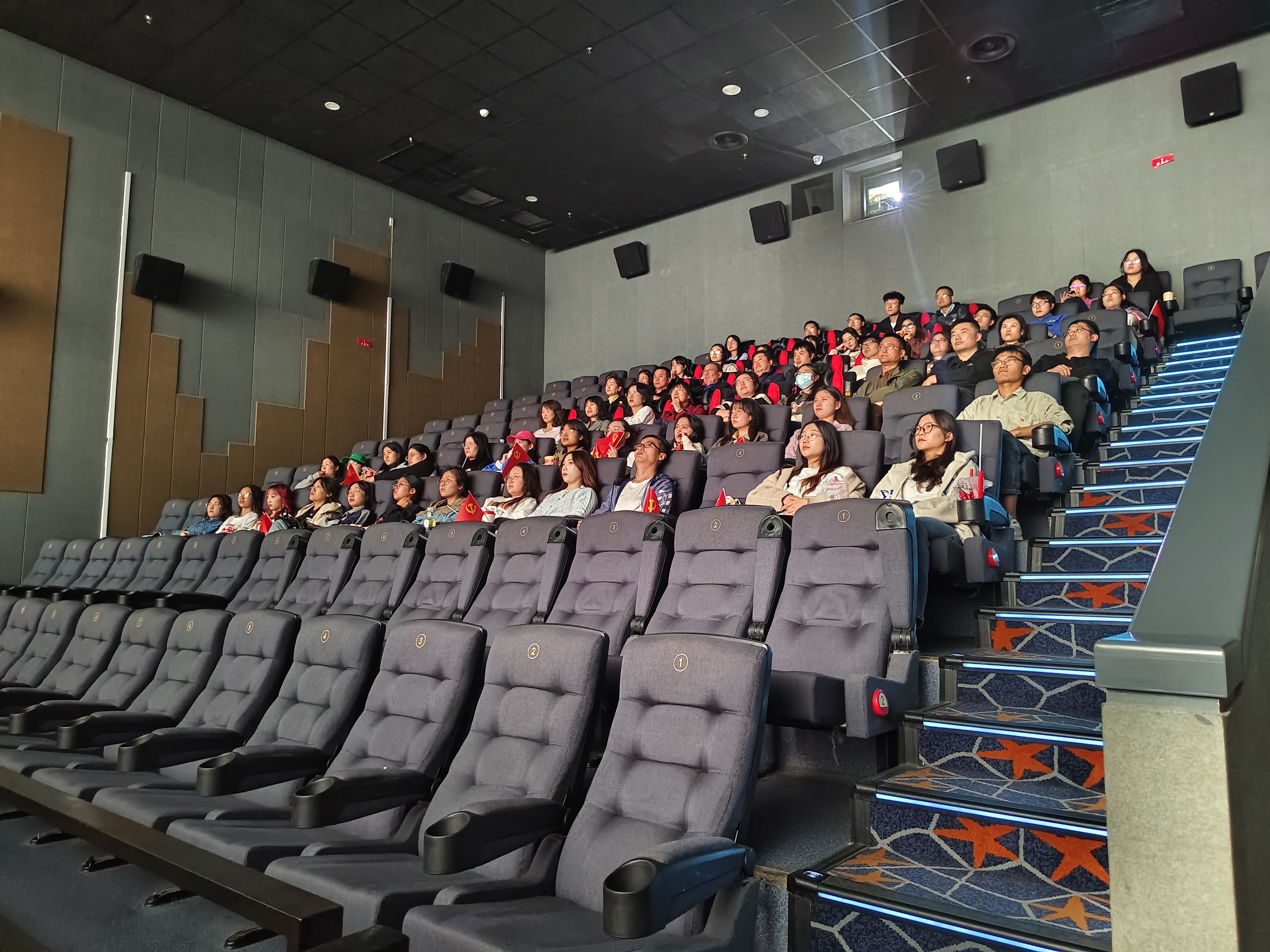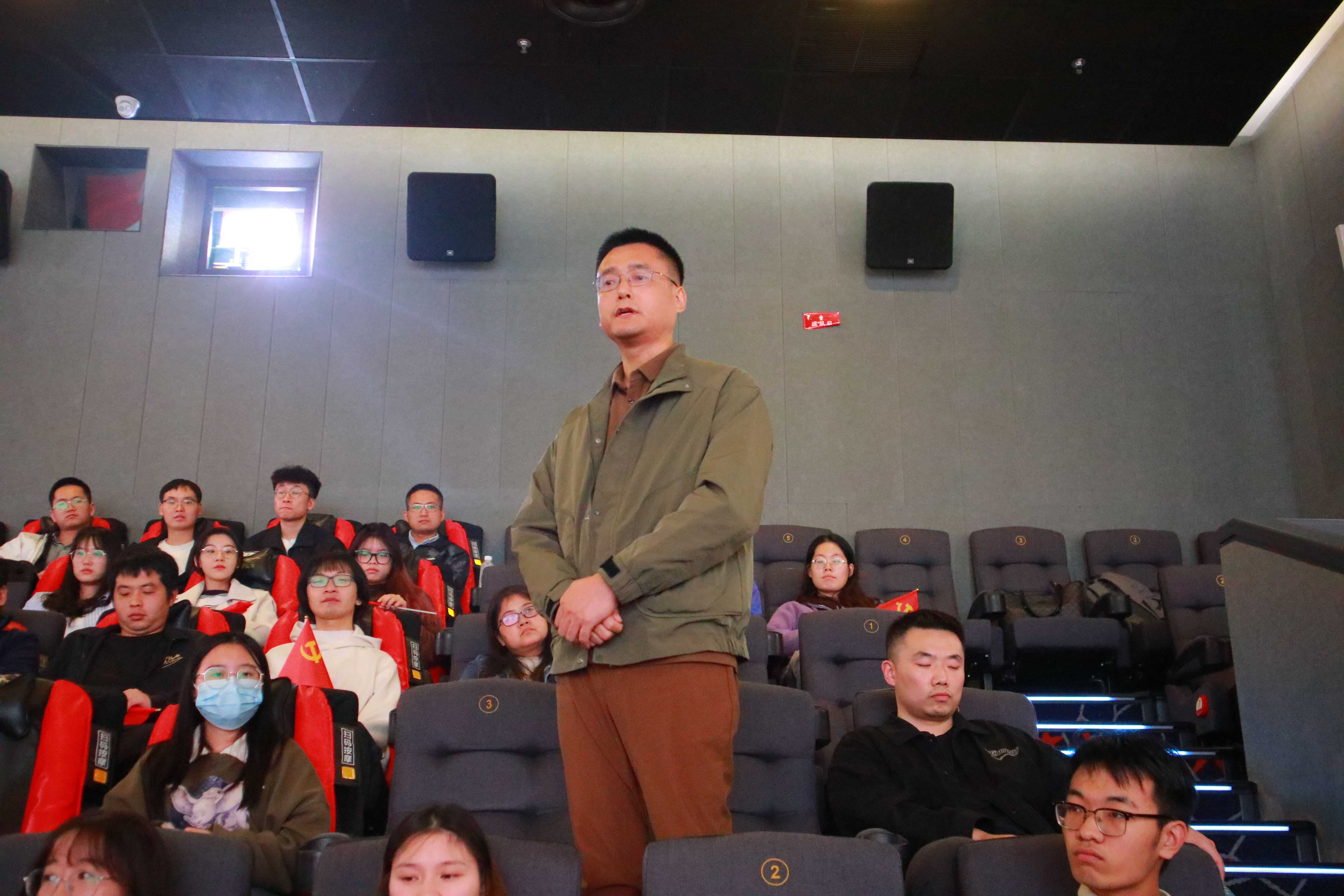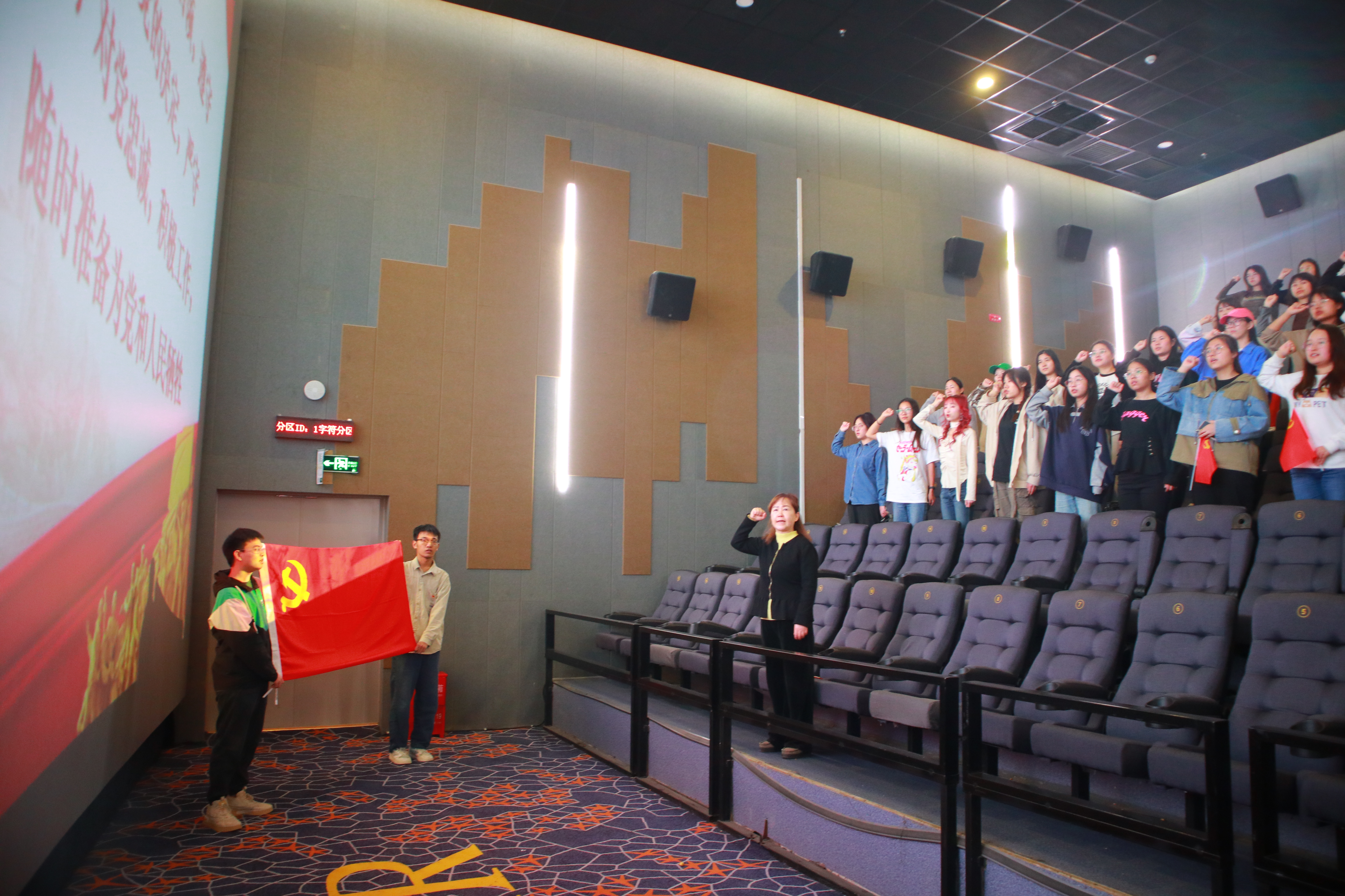 活动伊始,王丽真老师带领师生党员重温入党誓词。面向鲜红的中国共产党党旗,有力的宣誓声响彻大厅,铿锵字句表达了广大党员传承革命信仰、弘扬红色精神的决心和信心。伴随着掷地有声的入党誓词,拉开了此次观影活动的序幕。