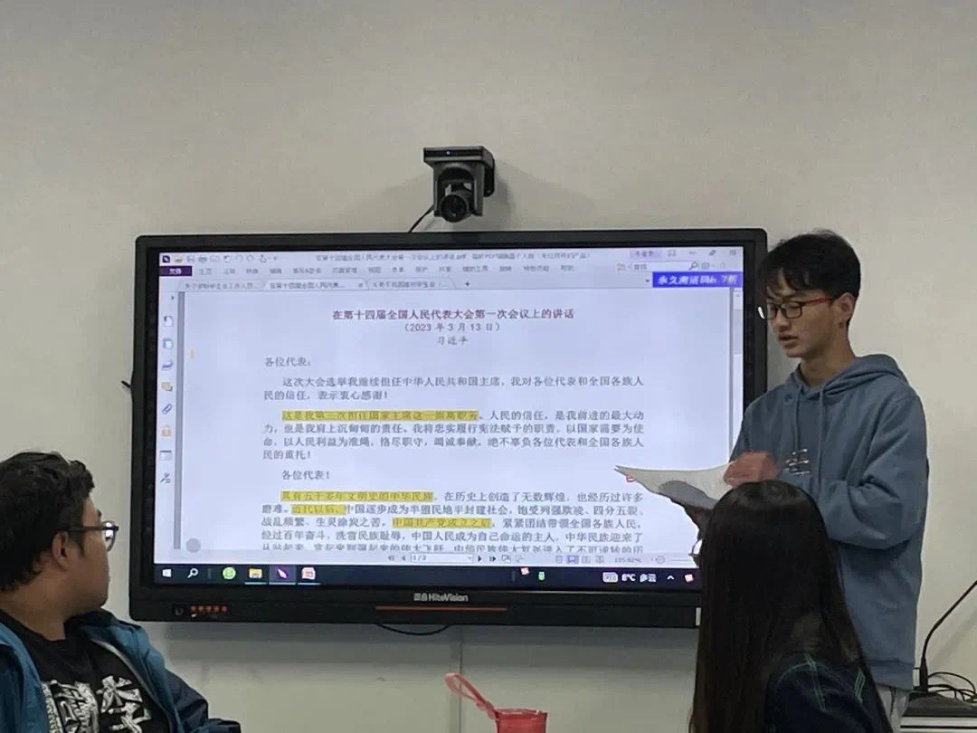 学生会工作人员许恒源也分享了他的理解。时代呼唤我们,人民期待我们。越是这样的时候,就越考验我们。今天我们所做的事情,是要不断的奋斗努力,将自己和时代相结合,不辜负时代的期许,不辜负人民的期盼。我们当接过前辈接力棒,赓续奋斗,为中国特色社会主义事业不断努力。