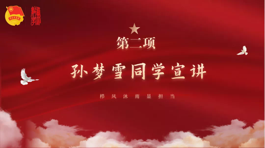 会议第二项,孙梦雪同学宣讲。学习部工作人员孙梦雪同学以《新时代新征程新绽放》为题进行了宣讲,分享了她对党的二十大精神的理解。新时代的十年,在党的坚强领导下,我们取得了一个个举世瞩目的伟大成就,现在站在新的历史起点上,我们要当好冲锋者,要不断砥砺奋进,创造更大辉煌!