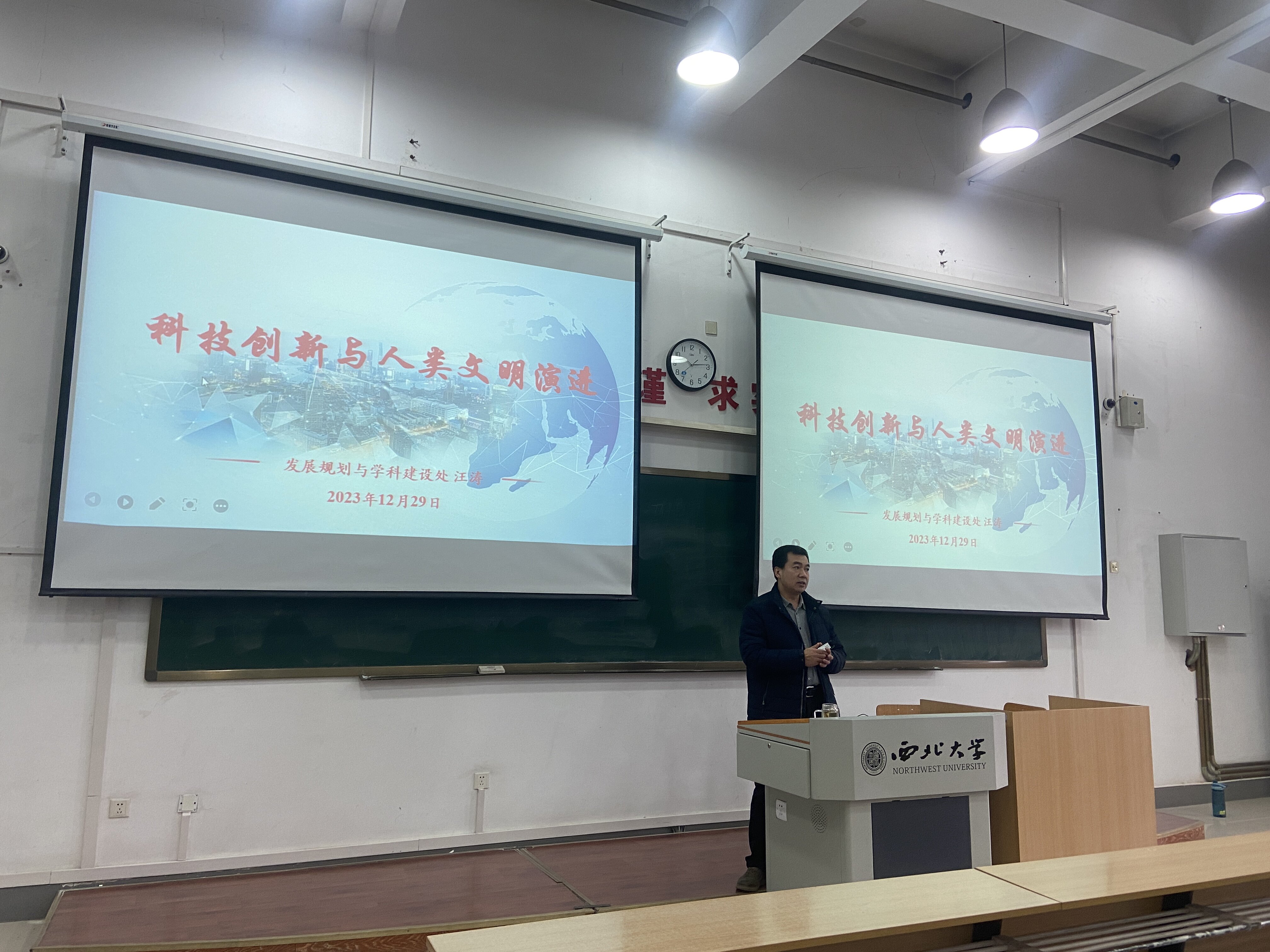 12月29日,校发展规划与学科建设处处长汪涛老师为今年会学生讲授“科技创新与人类文明演进”专题形势与政策课。学院辅导员周靖雯,2023级全体本科生参加了此次课程学习。
